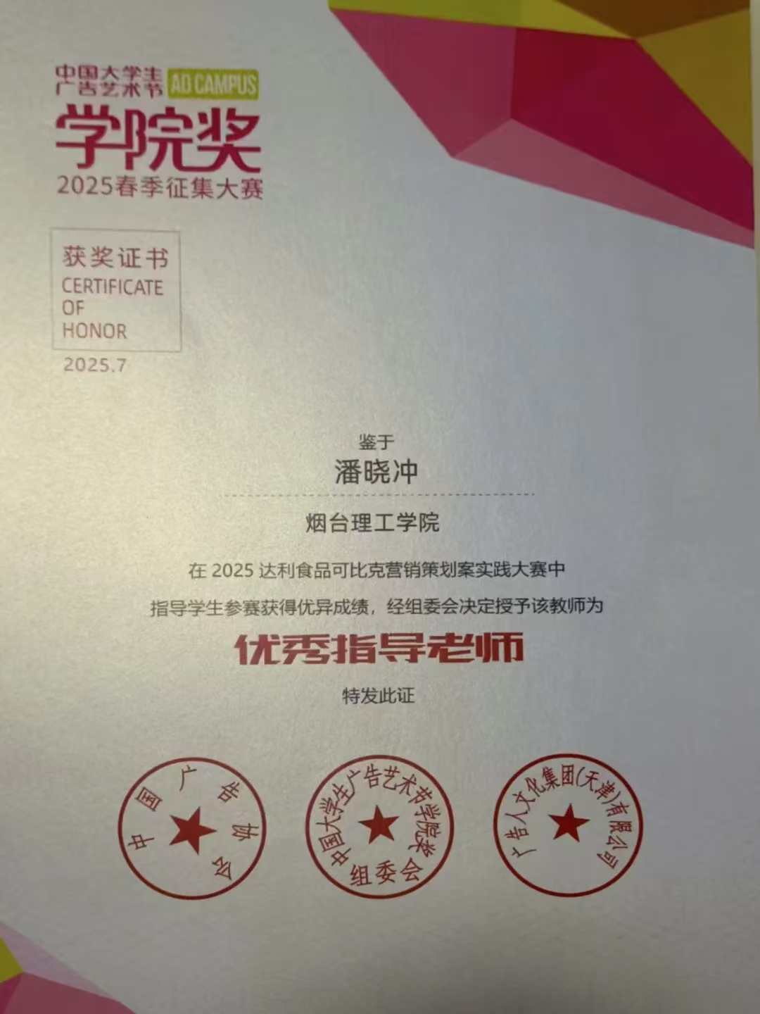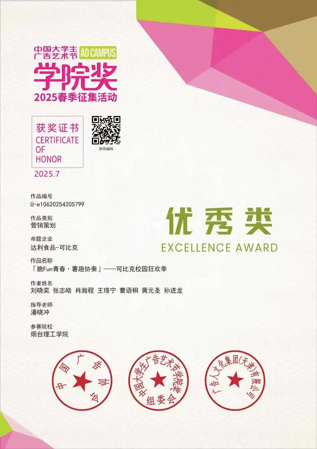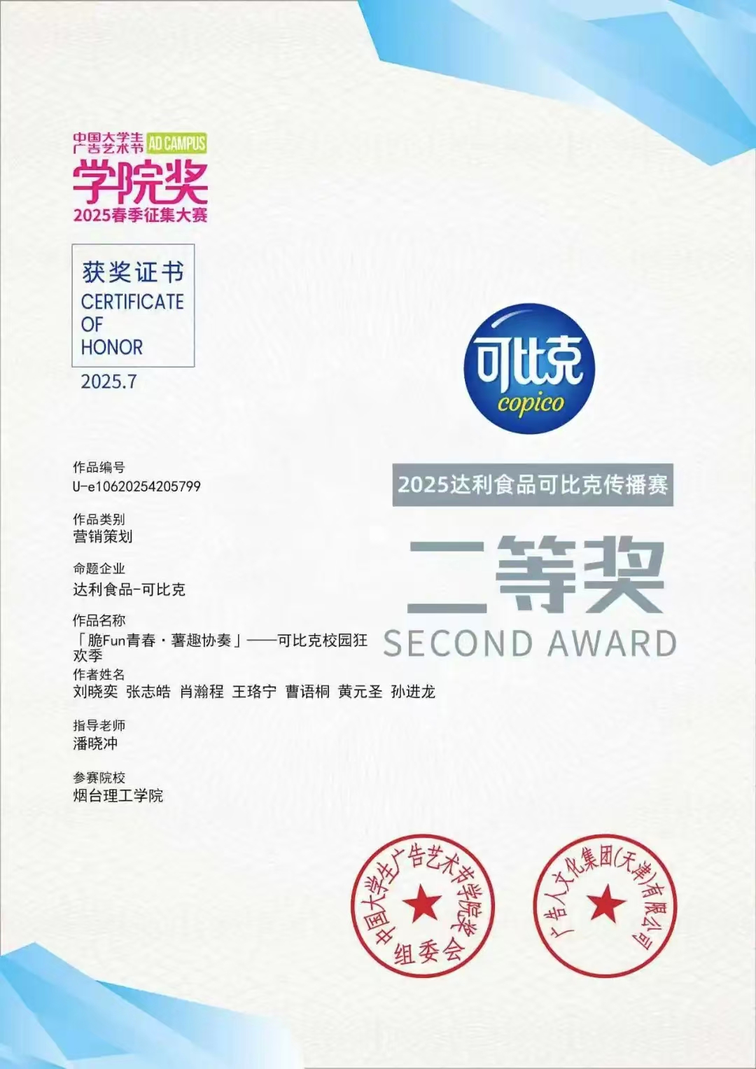 在中国大学生广告艺术节学院奖2025春季征集大赛中,文法师生喜获双奖,其营销策划作品《「脆Fun青春·薯趣协奏」——可比克校园狂欢季》在达利食品可比克传播赛中斩获二等奖,同时在常规赛中荣获优秀类奖项,展现出过硬的专业实力与创新思维。