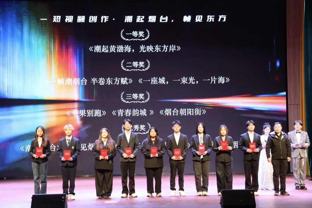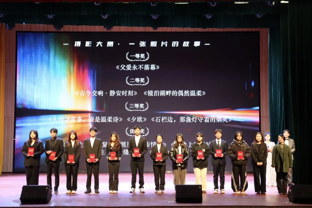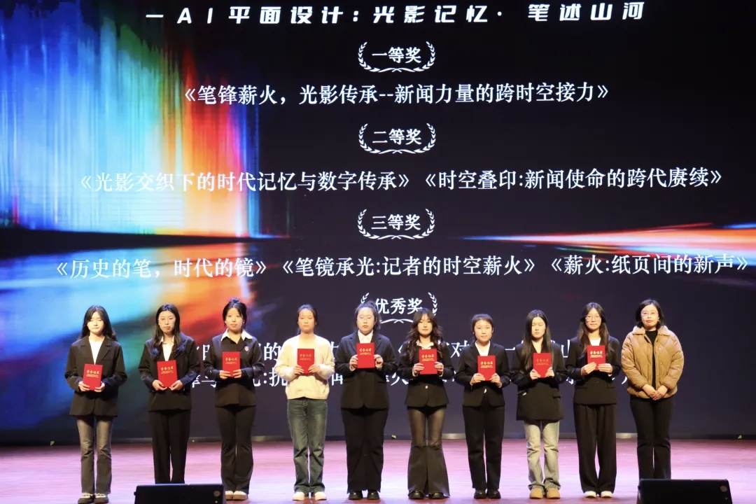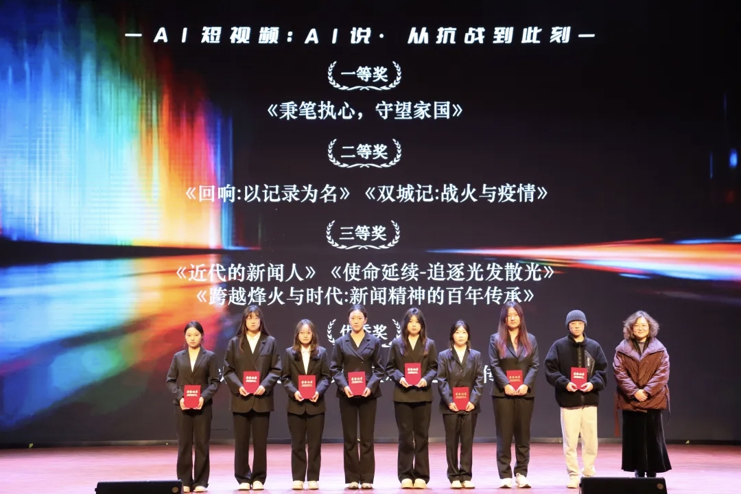 在颁奖典礼中,苏春景校长、侯伟力会长、张利然副会长、林莎常务副院长、郭亚奇副院长分别为“帧影传承共振”“潮起烟台,帧见东方”视频赛道、“一张照片的故事”摄影赛道、AI平面设计与短视频赛道的获奖学生颁奖。本届记者节作品征集历时一个月,各赛道作品亮点纷呈:视频作品深掘记者职业价值,摄影作品聚焦校园与社会观察,AI作品则以“抗战中的新闻力量”等主题,实现历史与当下的创新对话。