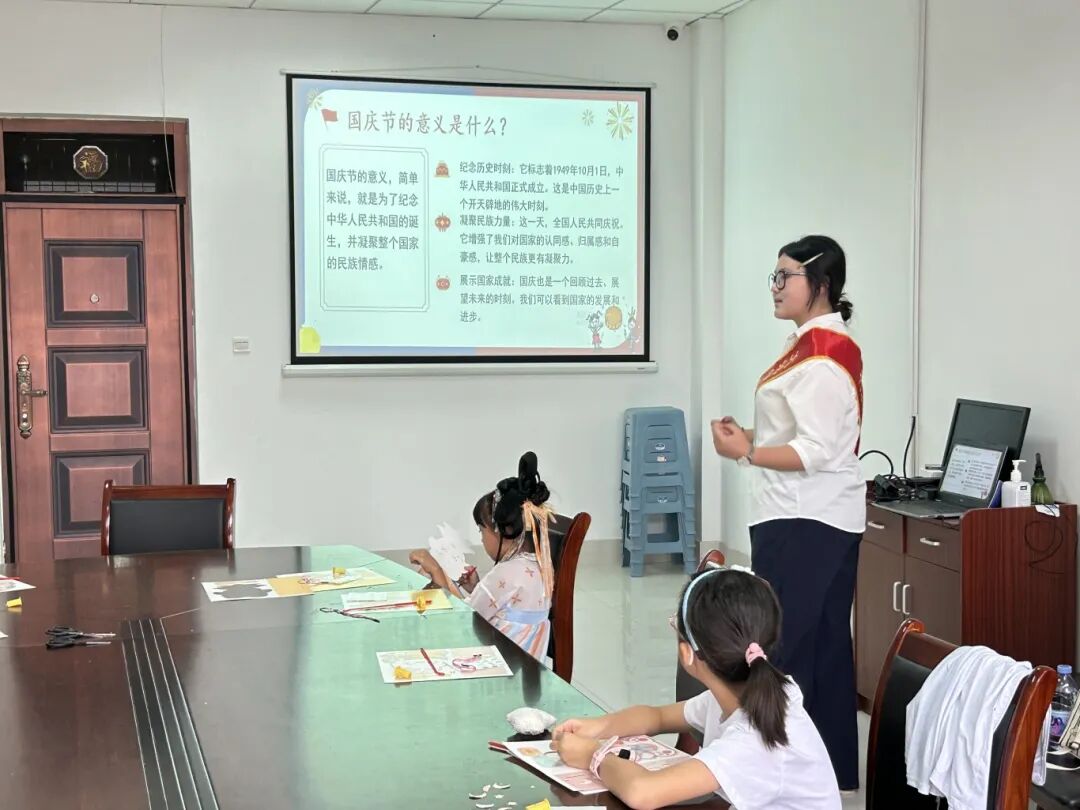 活动伊始,志愿者借助图文并茂的PPT,用童趣化的语言向小朋友们讲解了国庆节的由来、国庆节象征意义,以及中秋节的传说、赏月吃月饼的民俗传统。互动提问环节激发了孩子们的参与热情,现场应答踊跃。活动以寓教于乐的形式,让爱国情愫与文化记忆植根于心。手工制作环节中,志愿者们提前备好制作灯笼的材料,小朋友们在家长的陪伴与志愿者的指导下,动手裁剪、细心拼接,指尖翻飞间,一张张卡片蜕变为形态各异的灯笼。活动尾声,全体参与者手持自制的灯笼齐聚一堂,在镜头前定格下温馨瞬间。