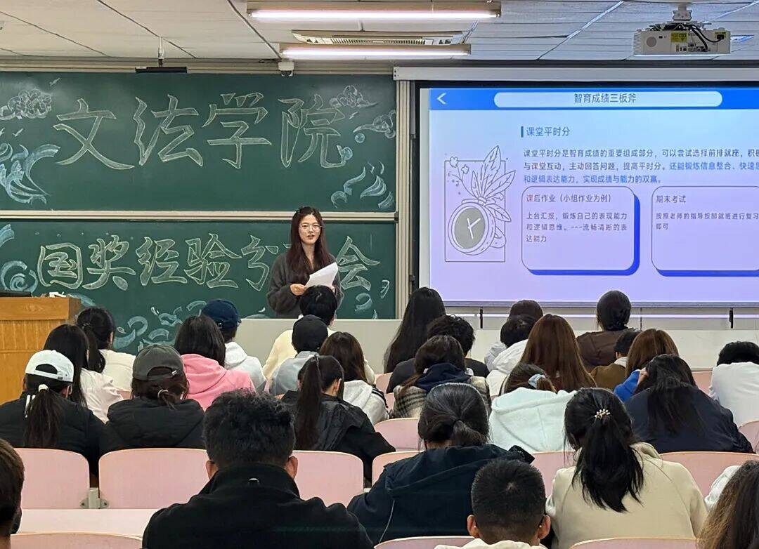 分享环节中,三位同学结合自身成长与实践经历,从不同维度展开交流。时晓珊以国家奖学金获取历程为切入点,系统分享了高效学习方法、综合素质测评准备策略,并针对关键环节给出可操作的建议;史洋立足“校园到职场”的衔接视角,重点阐述优化学习方法、培养竞赛能力、参与社会工作对提升求职竞争力的重要价值,为学生规划未来职业路径提供参考;周亚婷聚焦个人能力全面发展,围绕学习深度探索与课外实践拓展两大方向,分享了自身在提升综合素养过程中的经验与思考。三位主讲人的分享内容具体、逻辑清晰,具有较强的针对性与指导性,为在场学生提供了宝贵的学习借鉴。